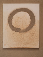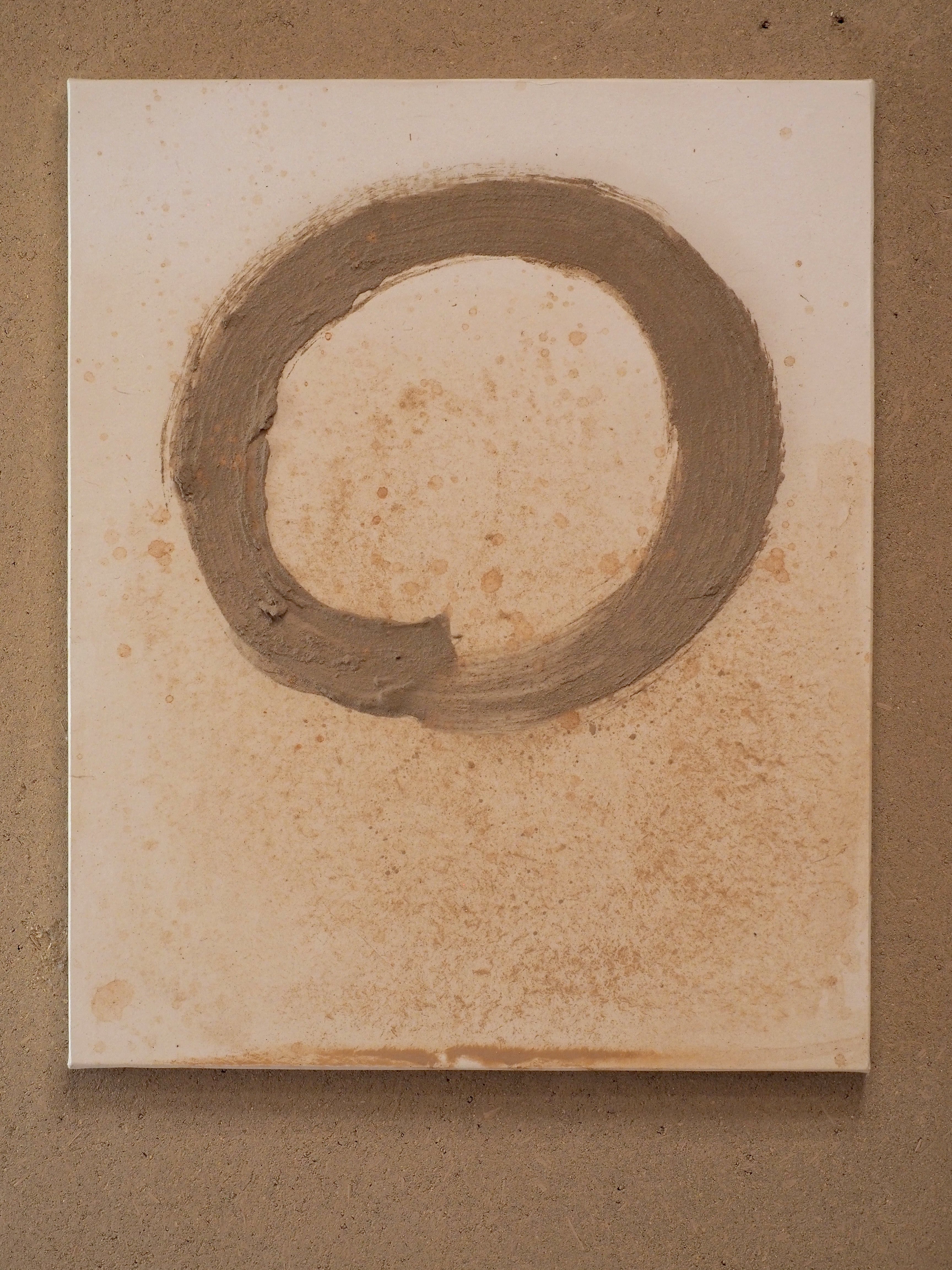 自然の恵みに包まれた日々。畑の土や山の土で描かれたこの円相は、大地と天空、あめとつちの交わりを感じさせる円相。始まりもなく終わりもない生命の巡り。そのシンプルな形状には、自然界の調和、宇宙そのものが秘められています。